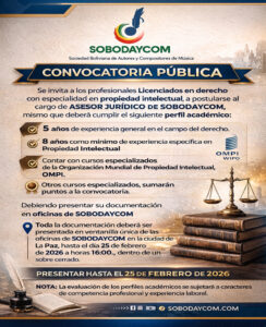 La Sociedad Boliviana de Autores y Compositores de Música, es una Sociedad Civil, Privada, sin fines de lucro, amparada por la Ley 1322 y el Decreto Supremo 23907; Legalmente constituida y autorizada por la autoridad competente - SENAPI, para funcionar como Sociedad de Gestión Colectiva; Afiliada a la Confederación Internacional de Sociedades de Autores y Compositores “CISAC”, LATINAUTOR y ALCAM.